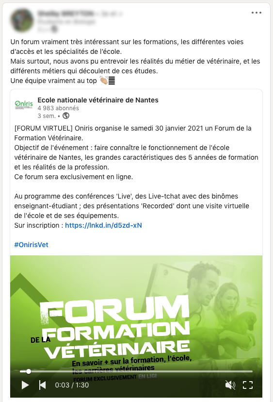 Les événements organisés par les écoles vétérinaires pour présenter les infrastructures, le cursus ou les métiers rencontrent d’importants succès. Sur la base de ce constat, un 1er Forum de la Formation Vétérinaire, conjoint aux 4 écoles vétérinaires, avait été organisé en 2019.